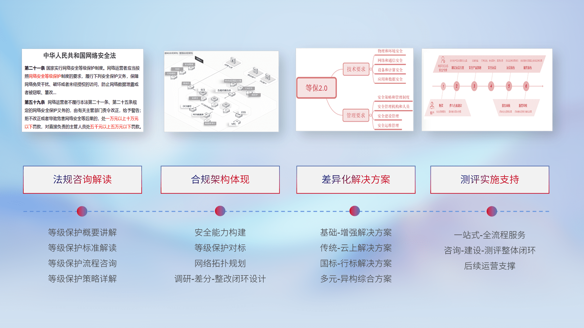 通过专业的法律咨询解读、、、合规架构体现、、、差异化解决方案、、测试实施支持等服务,,为客户量身打造等保合规体系。。。